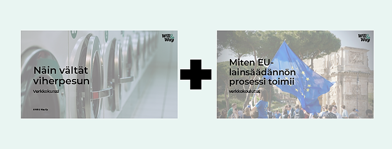 PakettiOta kerralla haltuun sekä viherpesua koskeva uusi lainsäädäntö että EU:n lainsäädäntöprosessin perusasiat! Kaksi verkkokoulutusta edulliseen yhteishintaan.