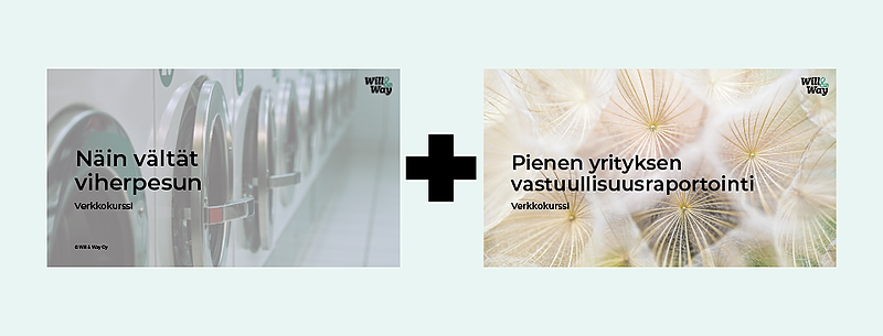 PakettiOta kerralla haltuun sekä viherpesua koskeva uusi lainsäädäntö että pienen yrityksen vastuullisuusraportoinnin perusasiat! Kaksi verkkokoulutusta edulliseen yhteishintaan.